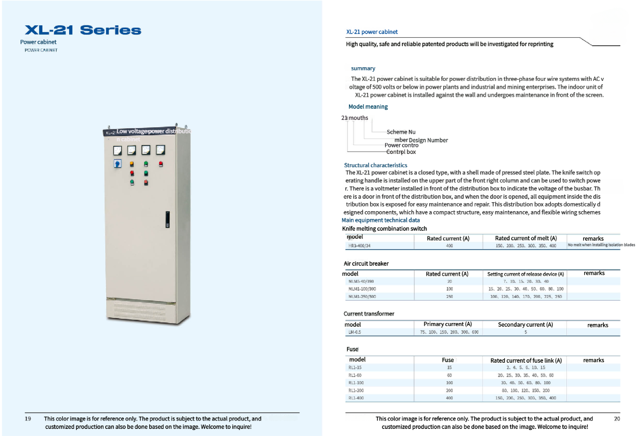 The XL-21 power cabinet is suitable for power distribution in power plants and industrial and mining enterprises, and is used for power distribution in three-phase four-wire systems with AC voltages of 500 volts and below. The indoor device of XL-21 power cabinet shall be installed against the wall and overhauled in front of the screen.